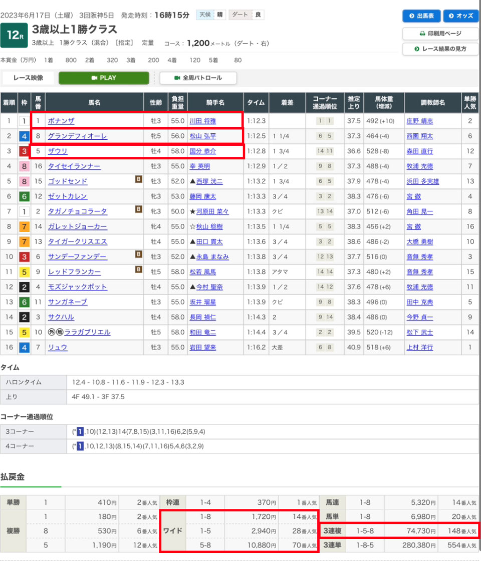 予想を見たからにはワイドの方が1点10,000円で30,000円分購入し、3連複の方が1点500円の18,000円分の合計48,000円分の馬券を購入しました。