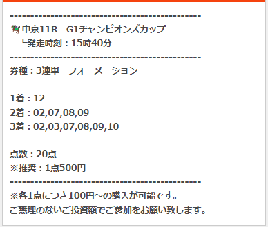 管理人さんが試されていたスタートダッシュプラン使ってみました。 推定配当30~50万でどんな結果になるか楽しみな週でした、結果は 3発3的中で38万1250円払戻し。 情報参加費用9,800円。 3鞍馬券代29,000円。 回収率→982% 情報料+馬券代を差し引いても→+34万2450円収支。 画像が1枚しか張れなかったので重賞の買い目だけを貼っておきます。 12/6土曜日 阪神10R妙見山ステークス/130,950円 12/7日曜日 阪神11Rりんくうステークス/119,350円 G1チャンピオンズカップ/130,950円